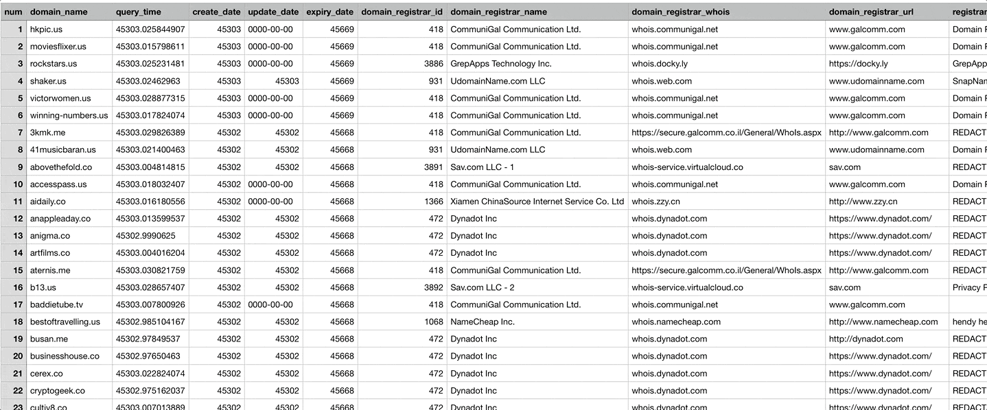 Domaines enregistrés quotidiennement avec des informations sur les prospects